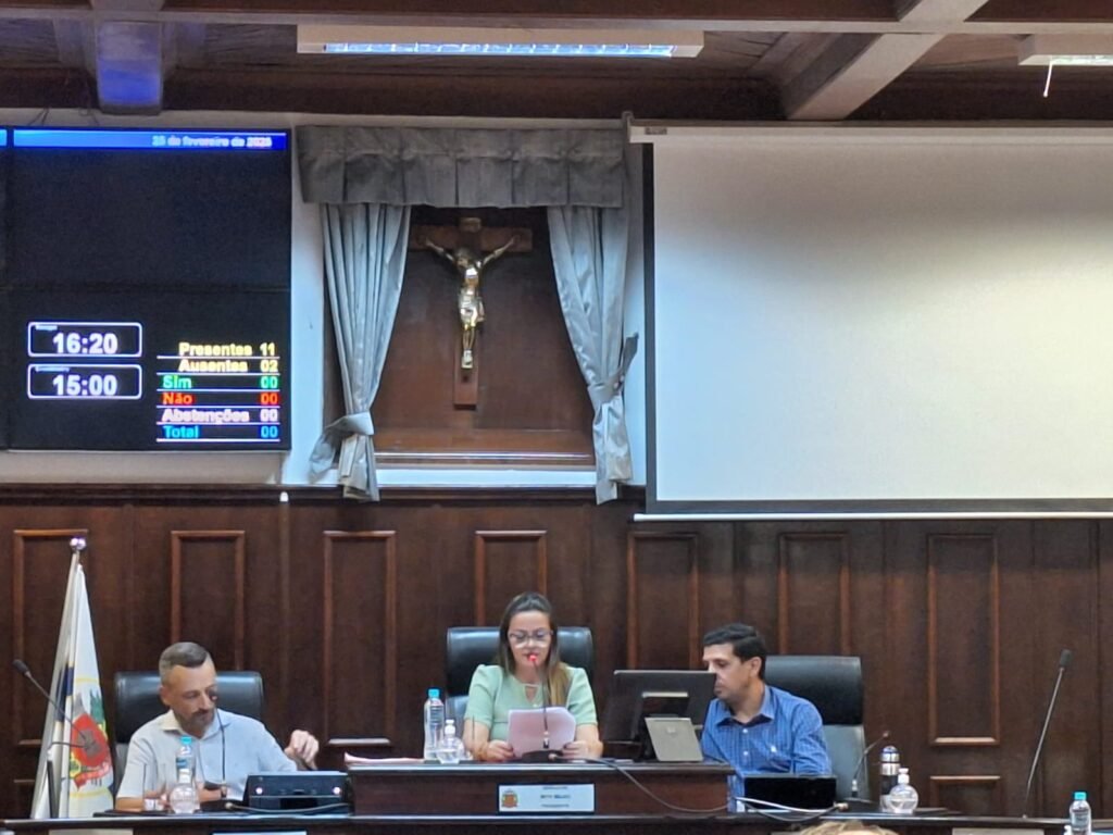A presidência da sessão ficou por conta da vereadora novata Elaine do Posto, auxiliada pelo vereador Thiago Gonçales, que já presidiu a Casa.
