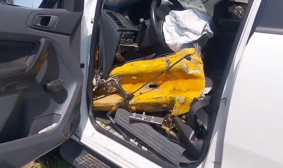 Com o impacto, parte da estrutura chegou a invadir o interior da picape.