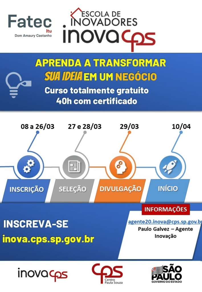 As inscrições vão do dia 08 de março de 2021 até o dia 26 de março de 2021. A seleção dos projetos será realizada nos dias 27 e 28 de março de 2021. E os resultados serão divulgados no dia 29 de março de 2021. Para fazer a inscrição acesse o site: https://inova.cps.sp.gov.br/escola-de-inovadores/
