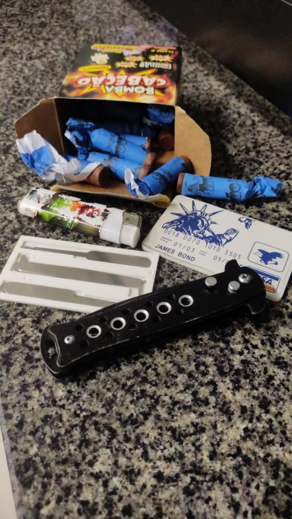 Em busca pessoal, foram localizados um kit de chave mixa, 11 artefatos explosivos de categoria D, um canivete e um isqueiro.