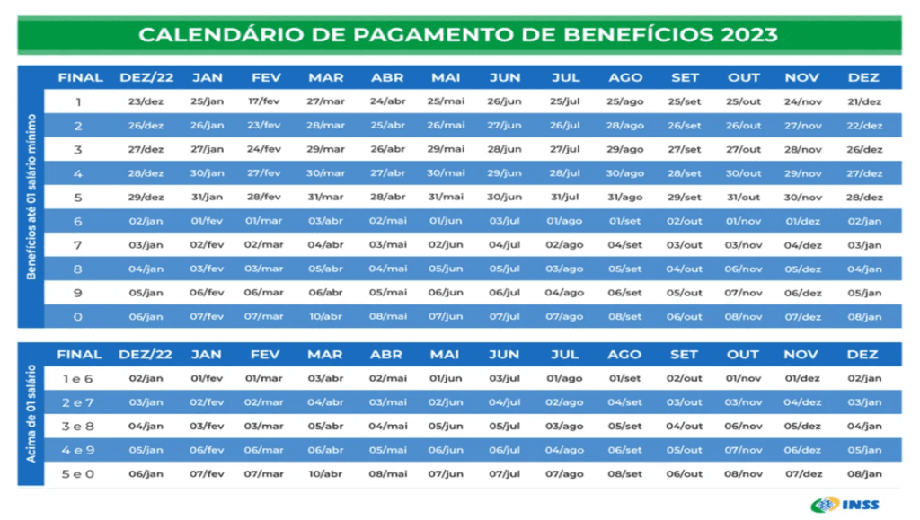Os segurados que recebem aposentadoria, pensão ou auxílio-doença podem conferir as datas de pagamento dos benefícios em 2023. O calendário, divulgado pelo INSS, deve ser seguido de acordo com o número do benefício do segurado. Para quem recebe um salário mínimo, os depósitos referentes a janeiro serão feitos entre os dias 25 de janeiro e 7 de fevereiro. Segurados com renda mensal acima do piso nacional terão seus pagamentos creditados a partir de 1º de fevereiro. Os valores já serão pagos com o reajuste do salário mínimo, cujo valor ainda não foi definido.