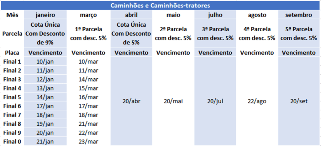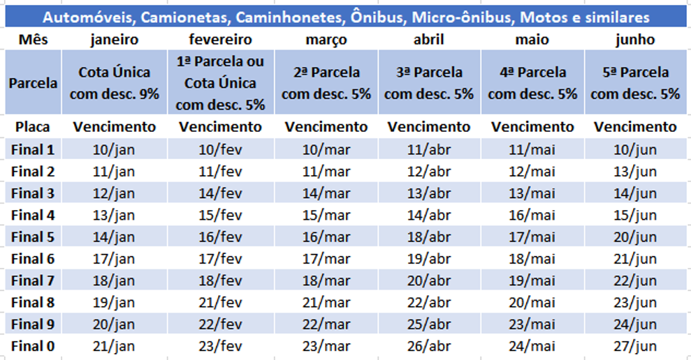 Os proprietários de veículos usados que quitarem o imposto antecipadamente, em cota única, em janeiro, terão desconto de 9%. Para os que pagarem o tributo integralmente em fevereiro, ou preferirem parcelar, a redução será de 5%. Para os donos de veículos 0 km, o desconto continua de 3% no pagamento até o quinto dia da emissão da nota fiscal, e os que preferirem também poderão parcelar em cinco vezes, sem desconto.