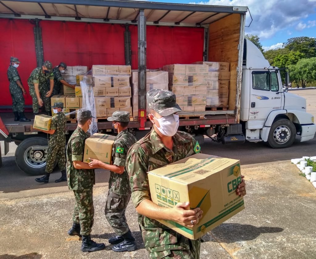 Para o transporte das cestas básicas, no dia 20 de maio, militares do 2º Grupo de Artilharia de Campanha Leve (GAC L) – Regimento Deodoro – descarregaram e armazenaram os 5,4 mil kits de alimentação (foto) .