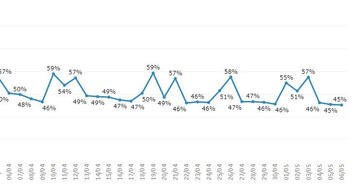 Nesta terça e quarta-feira, foi registrado 45% de isolamento. O índice é o mais baixo desde o começo desde o dia 21 de março. O fato de ser uma semana de pagamentos de salários e aposentadorias poderia ser um dos motivos da maior movimentação nas ruas.
