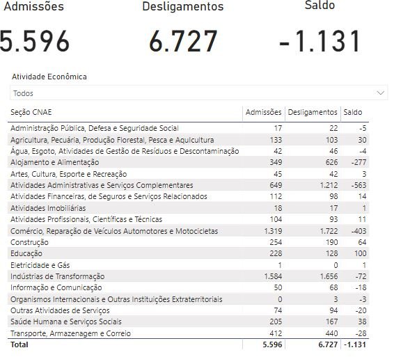 Os números são analisados pelo tanto de demissões e contratações na cidade. Foram 5.596 admissões e 6.727 demissões.