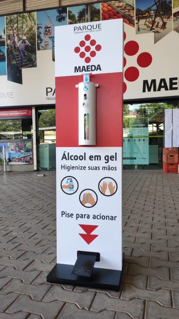 O Parque Maeda tem adotado uma série de medidas que visam garantir a saúde e segurança de clientes, parceiros e colaboradores em meio à pandemia do novo coronavírus – Covid-19. Entre as ações implantadas pelo parque, uso de máscaras por todos os colaboradores e instalação de painéis com álcool em gel que podem ser acionados com os pés – iniciativa visa reduzir risco de contágio ao dispensar o uso das mãos para extrair o gel.