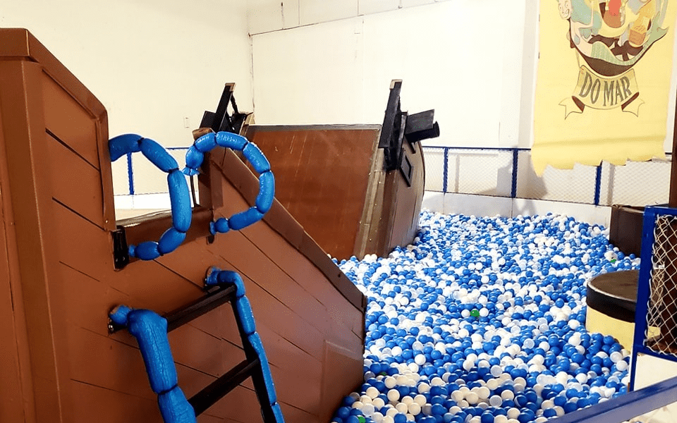 Um navio naufragado pelo mar de bolinhas garante diversão nos escorregadores, barco e farol. Atração com bilheteria.