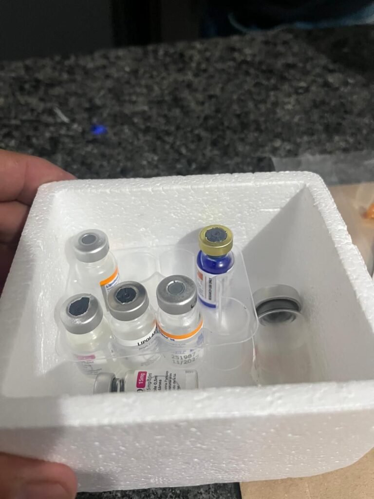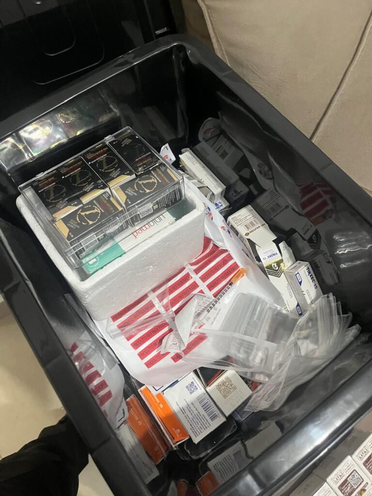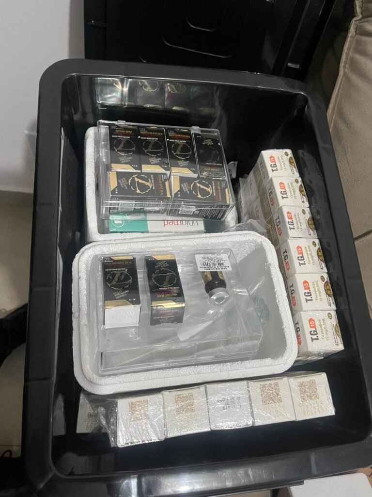 Durante as buscas, os policiais encontraram ampolas com suposta Tirzepatida, anabolizantes e suplementos à base de ervas, todos sem registro sanitário junto à Anvisa, além de seringas e outros materiais utilizados para aplicação das substâncias.