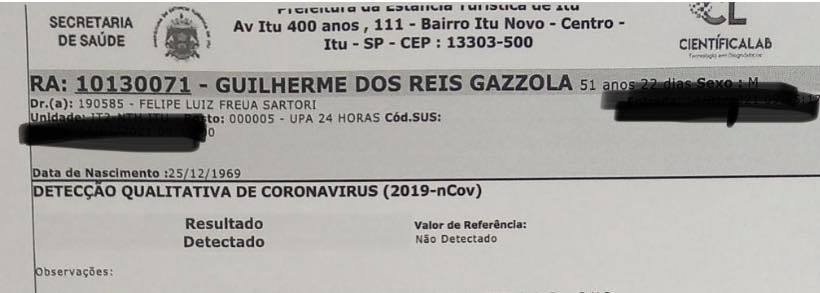 O prefeito Guilherme Gazzola postou em sua página no Facebook que no final de semana um teste para Covid-19 deu positivo. Ele também expôs seu exame, realizado no UPA Aparecida.