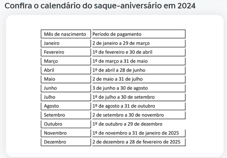 O período de saques começa no primeiro dia útil do mês de aniversário do trabalhador. Os valores ficam disponíveis até o último dia útil do segundo mês subsequente. Caso o dinheiro não seja retirado no prazo, volta para as contas do FGTS em nome do trabalhador.