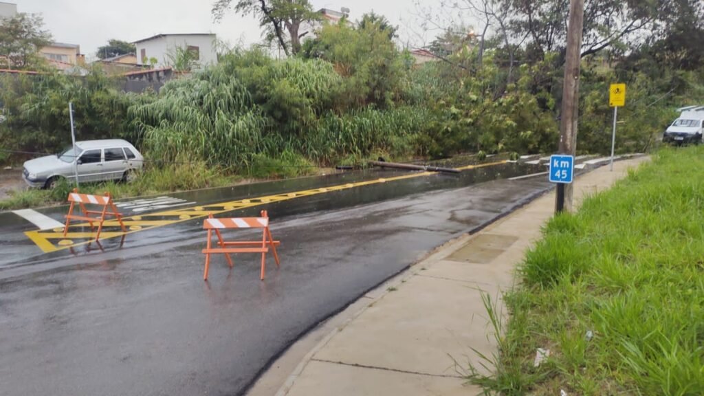 Duas árvores caíram: uma na estrada velha Itu- Salto. Com a queda, um poste foi atingido e também caiu, fechando a via.
