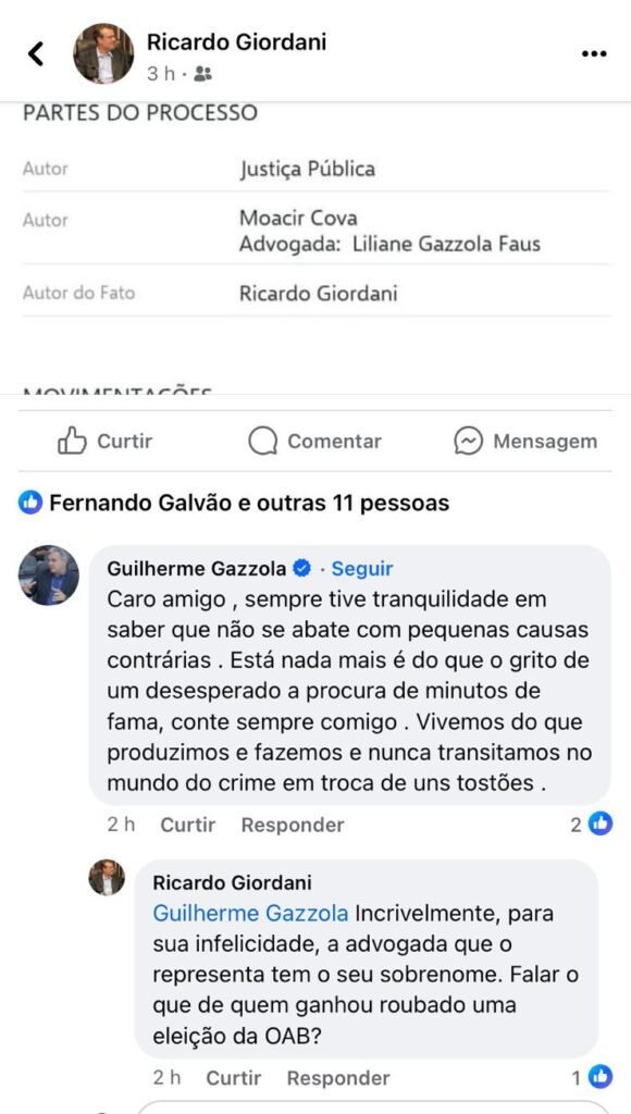 Nas redes sociais, Giordani postou parte do processo, em que aparece que a ação é por “calúnia, injúria e difamação”.