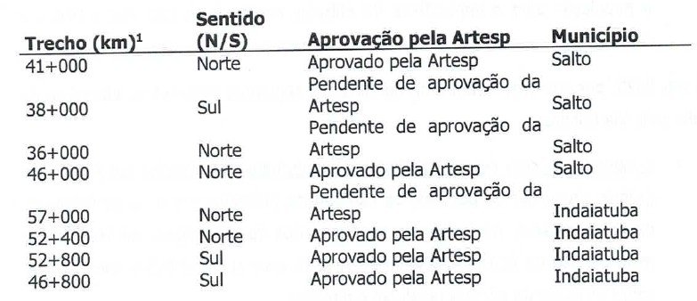 - Desses, três em Indaiatuba e um em Salto já tiveram aprovação da Artesp (Agência de Transportes do Estado de São Paulo) e devem ser implantados em breve.